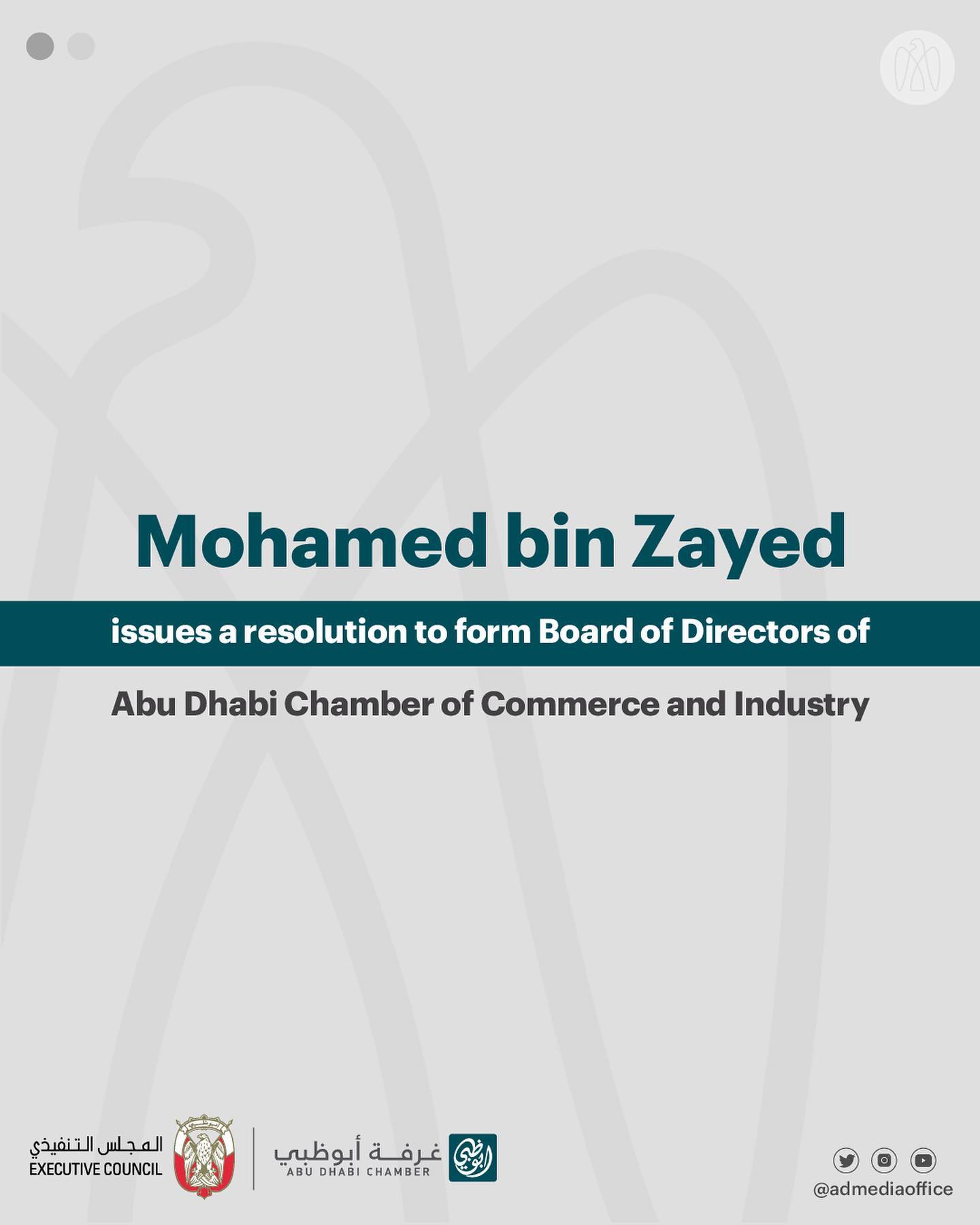 His Highness Sheikh Mohamed bin Zayed Al Nahyan, Crown Prince of Abu Dhabi, Deputy Supreme Commander of the UAE Armed Forces and Chairman of the Abu Dhabi Executive Council, has issued a resolution to form a new Board of Directors for the Abu Dhabi Chamber of Commerce and Industry.