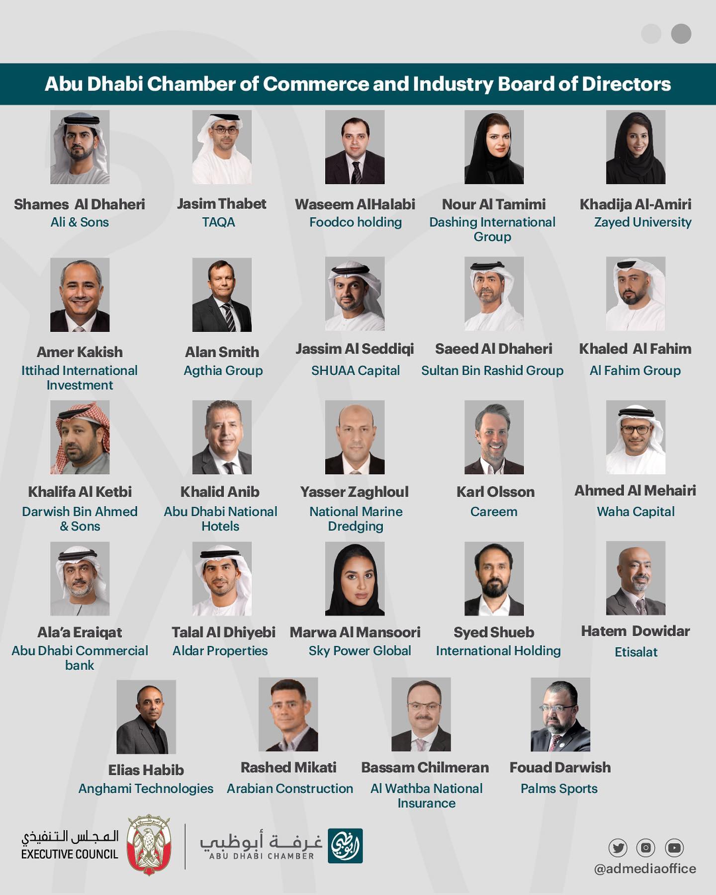 His Highness Sheikh Mohamed bin Zayed Al Nahyan, Crown Prince of Abu Dhabi, Deputy Supreme Commander of the UAE Armed Forces and Chairman of the Abu Dhabi Executive Council, has issued a resolution to form a new Board of Directors for the Abu Dhabi Chamber of Commerce and Industry.